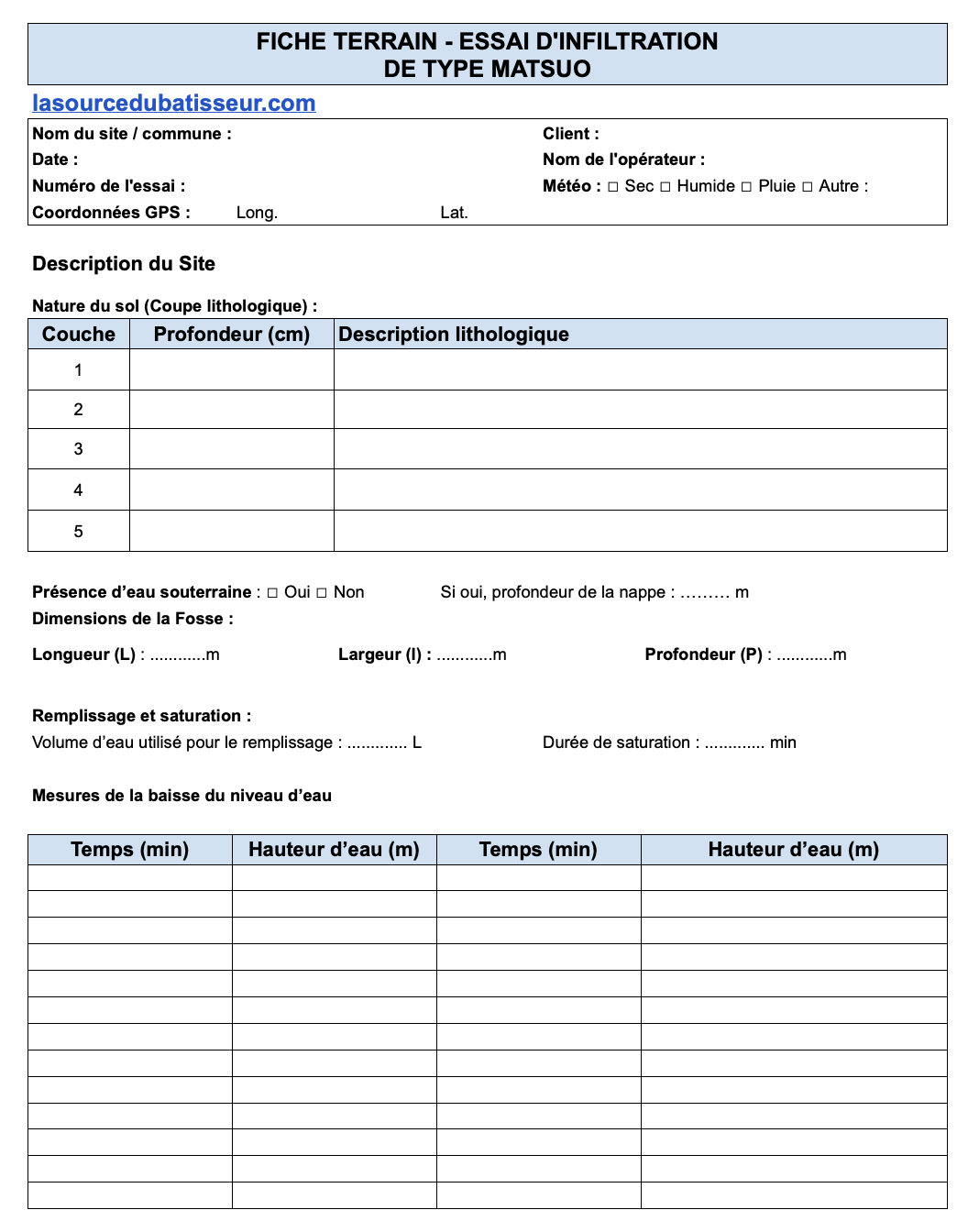 🔲 Carnet ou fiche terrain pour réaliser une coupe lithologique de la fosse et noter les mesures d’infiltration.