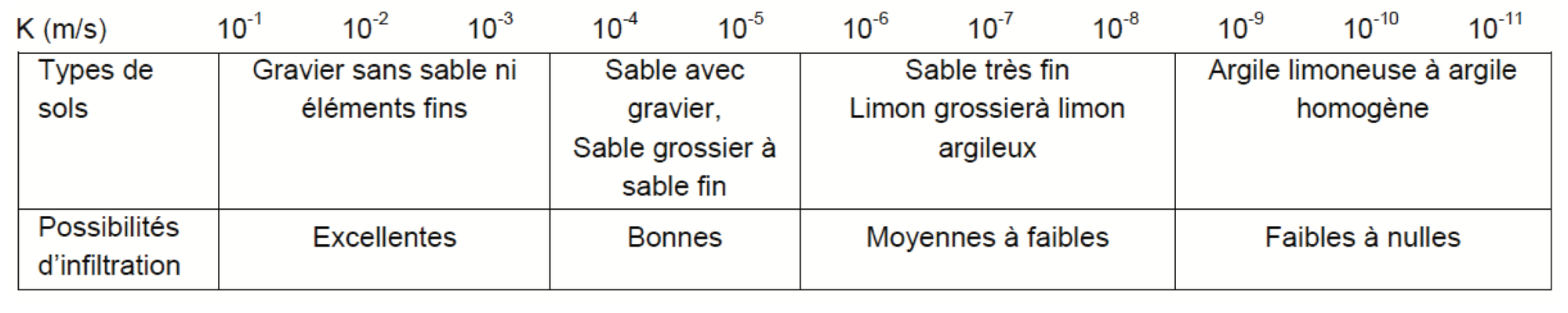 Enfin, la perméabilité est comparée aux ordres de grandeur établis par Musy et Soutter pour déterminer si les conditions d’infiltration sont acceptables ou si il faut abandonner l'idée d'infiltrer.